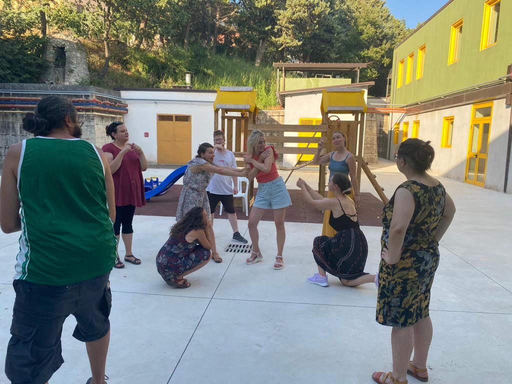 We were a small group of participants and most of them had already met in previous parts of the project, so it was easier to work together as a group. Activities such as singing together, energisers, music creation using our bodies, games that demanded collaboration without words, helped us connect and brought the group together. All activities/workshops helped us learn to collaborate, establish group goals, build trust, interact as a group, be present, help and support and respect each other.