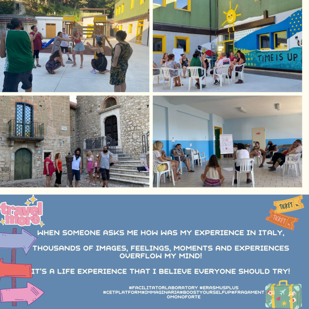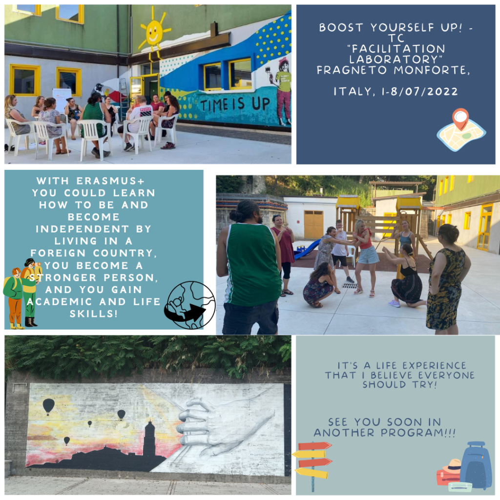 We participated from 1st to 8th of July 2022 at the Laboratory meeting “Facilitation Laboratory” in Fragneto Monforte, Italy which was part of the project “Boost Yourself Up!”. Even though the organisers had to change the venues at the last minute due to Covid spreading, everything turned out very well. The organisers were really friendly and ready to help us deal with every issue we had.